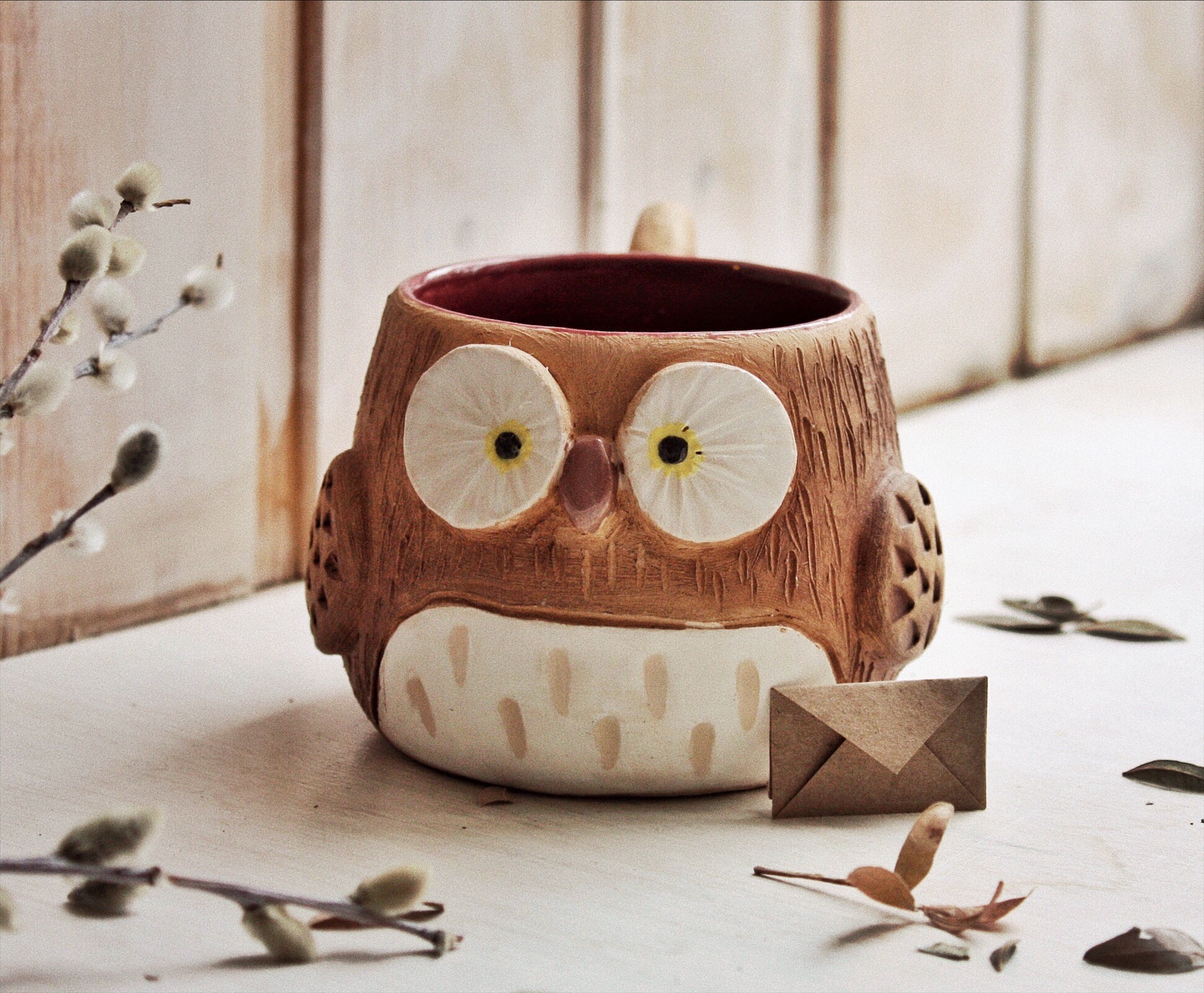 Ушки на макушке, вместо ручки - хвост! Кружки-зверушки - самые добрые и очаровательные. Можно сделать кружку-котика или лису, кружку-панду или мышку. А если у вас есть друг-настоящая сова, то кружка-совенок ему очень понравится! Пить горячее какао, держа в руках кружку с доброй мордашкой намного теплее и приятнее!