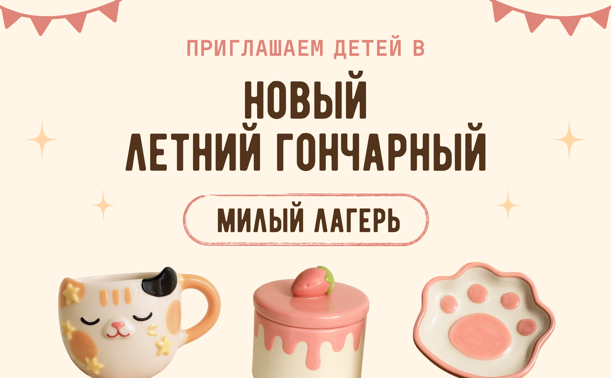 Летний гончарный «Милый лагерь» — это 5-дневное творческое приключение, которое оставит незабываемые воспоминания о лете: ☀️ гончарный курс ☀️ интерактивная программа ☀️ и даже перерывы на легкий перекус