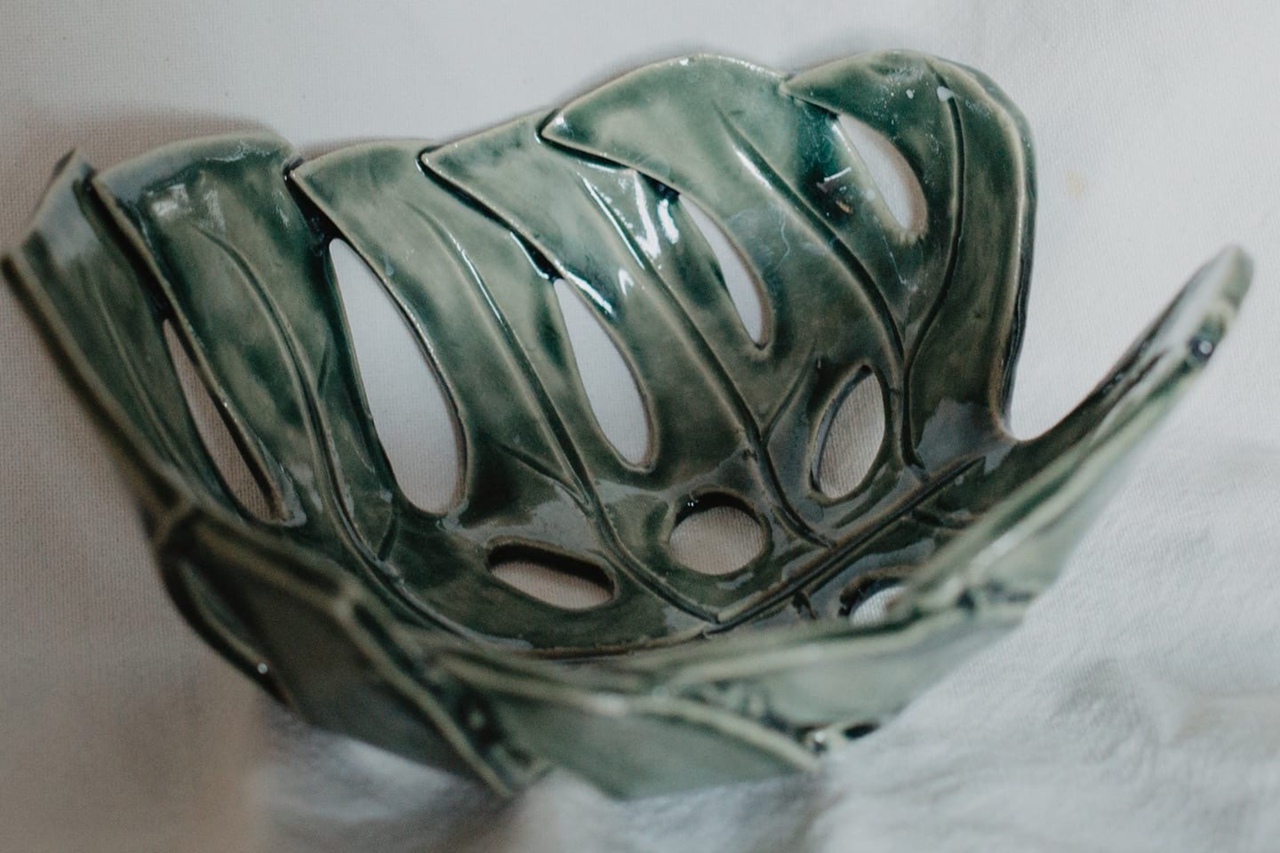 На этом мастер-классе мы используем технику пласта: раскатываем большой кусок глины, делаем пласт ровным и гладким. Далее рисуем лист монстеры - ее форму, изгибы, отверстия. Далее вырезаем, тщательно разглаживаем все края, придаем форму и наносим узор.